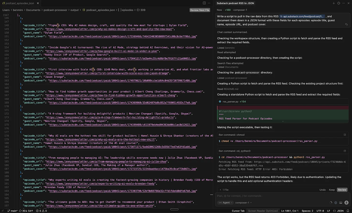 Cursor의 Composer를 사용하여 레니의 팟캐스트 RSS 피드에서 메타데이터를 가져오는 간단한 스크립트 작성