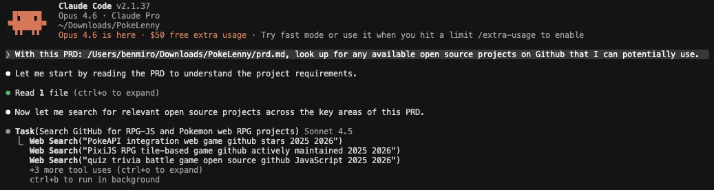 PRD를 입력으로 사용하여, 저는 먼저 Claude Code에게 더 빠르게 진행하는 데 도움이 될 수 있는 오픈 소스 프로젝트를 검색해 달라고 요청했습니다. 이것은 제가 항상 초기에 하는 일입니다. 종종 사람들이 이미 비슷한 것을 만들어 GitHub에 오픈 소스로 공개했는데, 이를 통해 설정을 훨씬 더 빠르게 할 수 있습니다.