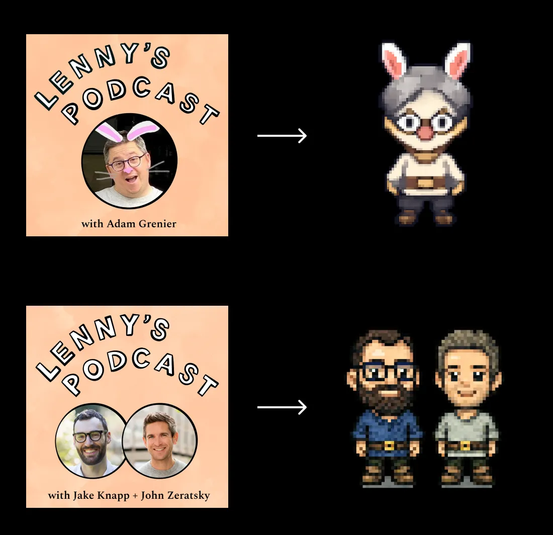 예를 들어, Adam Grenier가 원래 팟캐스트 커버에서 프로필 이미지 위에 실제로 토끼 귀를 달고 있다는 것을 몰랐습니다—거의 지울 뻔했습니다. 또는 Jake Knapp과 John Zeratsky의 에피소드처럼 커버 이미지에 두 사람이 있는 에피소드가 있어서, AI에게 각 사람에 대해 별도의 단일 이미지를 생성하도록 지시해야 했습니다.