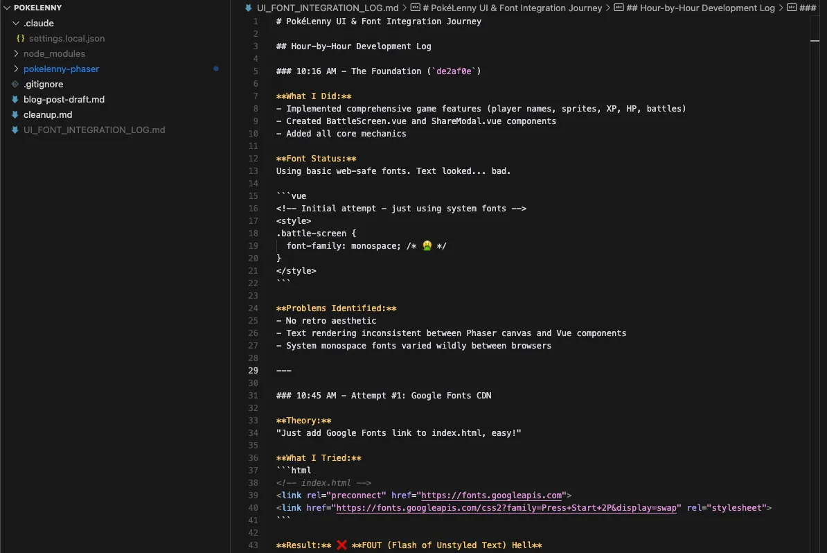 글꼴 및 UI 렌더링 수정 시도를 추적하는 Claude Code의 마크다운 로그