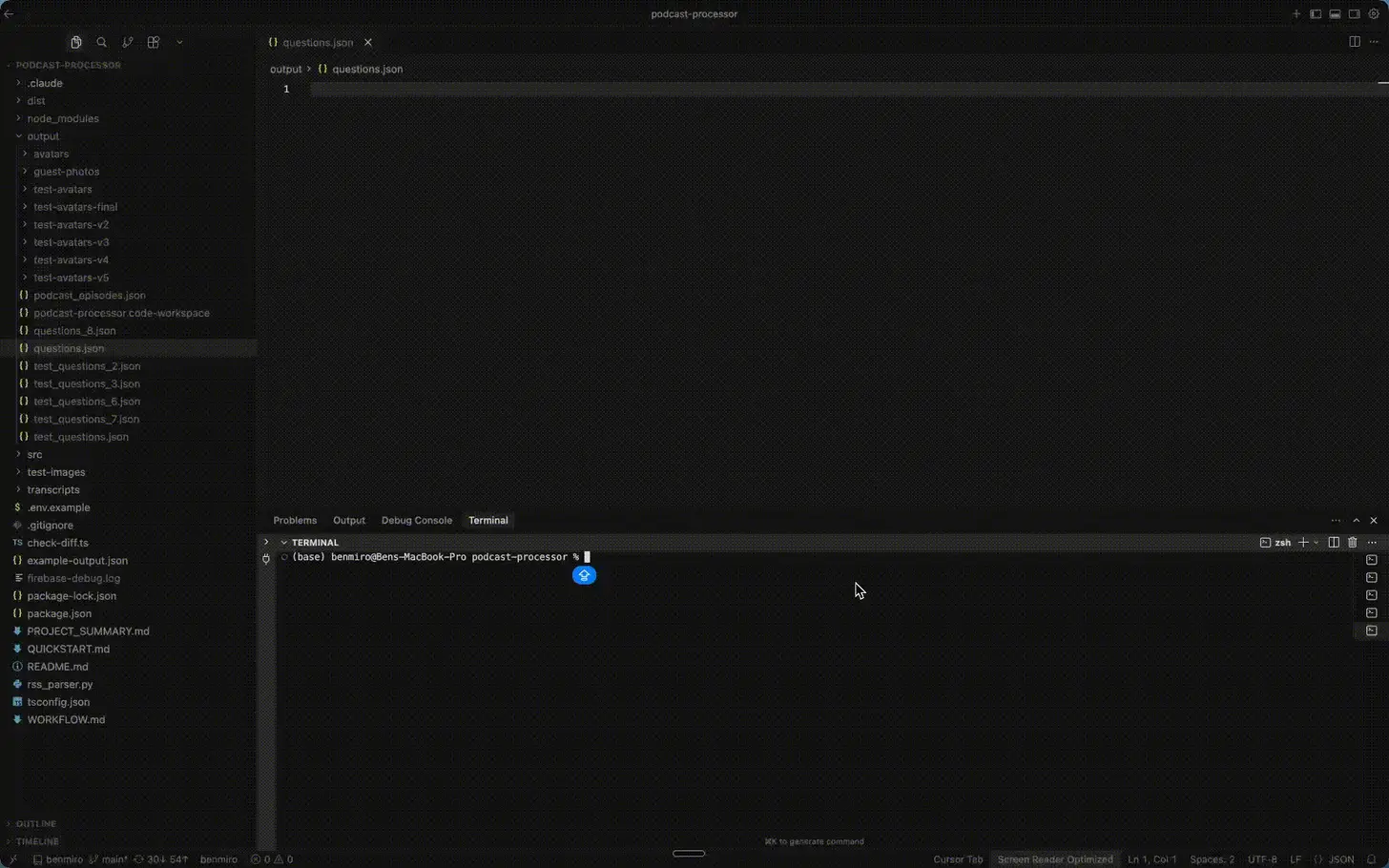 이를 위해 Cursor의 Composer로 팟캐스트 RSS 피드를 가져와 각 대본에 누락된 메타데이터를 첨부했습니다. 이것은 게임이 실제로 사용할 수 있는 훨씬 더 완전한 데이터셋을 제공했습니다.