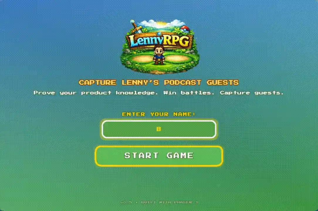레니의 팟캐스트를 작은 롤플레잉 게임(RPG)으로 만들면 어떨까요? 픽셀 세계를 탐험하고, 레니 팟캐스트 게스트를 만나고, 제품 지식을 시험하기 위해 그들과 경쟁하고, 이기면 포켓몬처럼 포획하는 게임 말입니다. 이렇게 LennyRPG가 탄생했습니다.